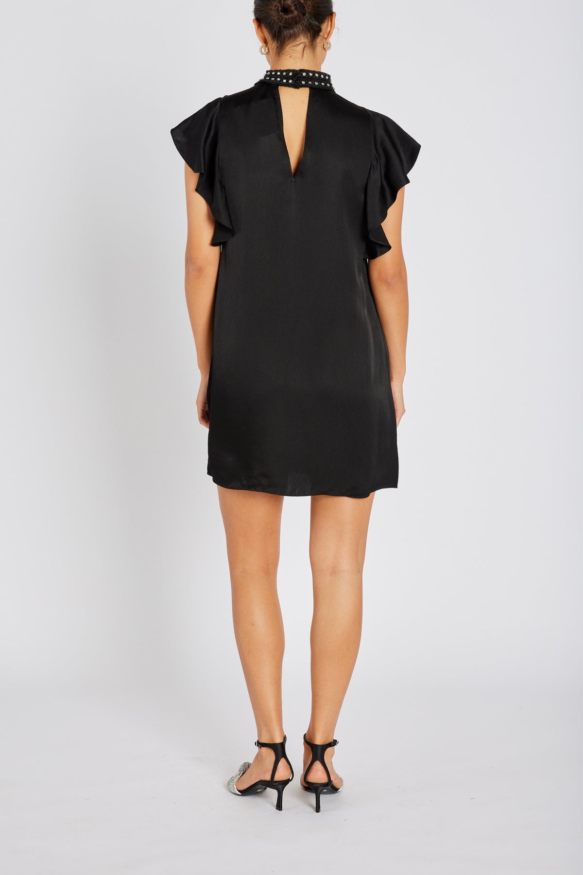 ArfajBBNatil dress is an elegant piece featuring short ruffled sleeves and a high neckline with decorative stones. A timeless silhouette with refined details.