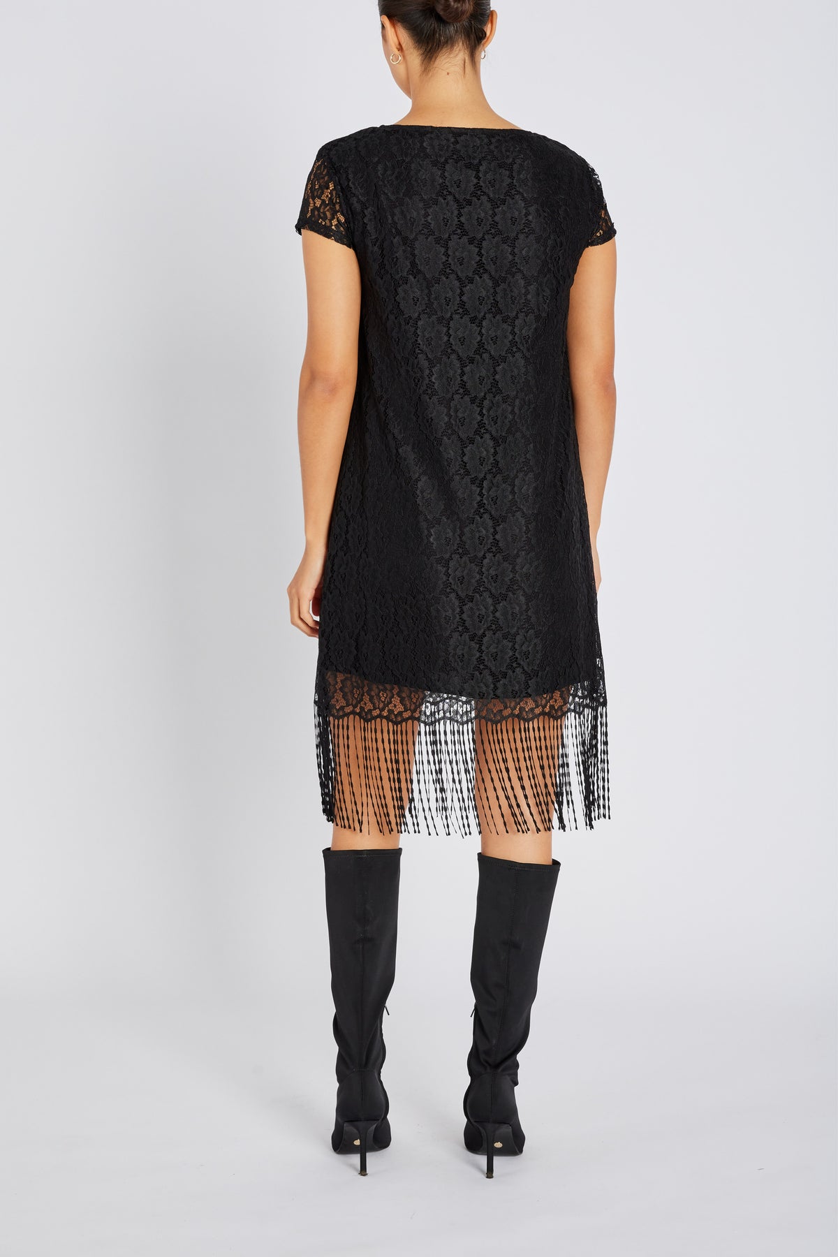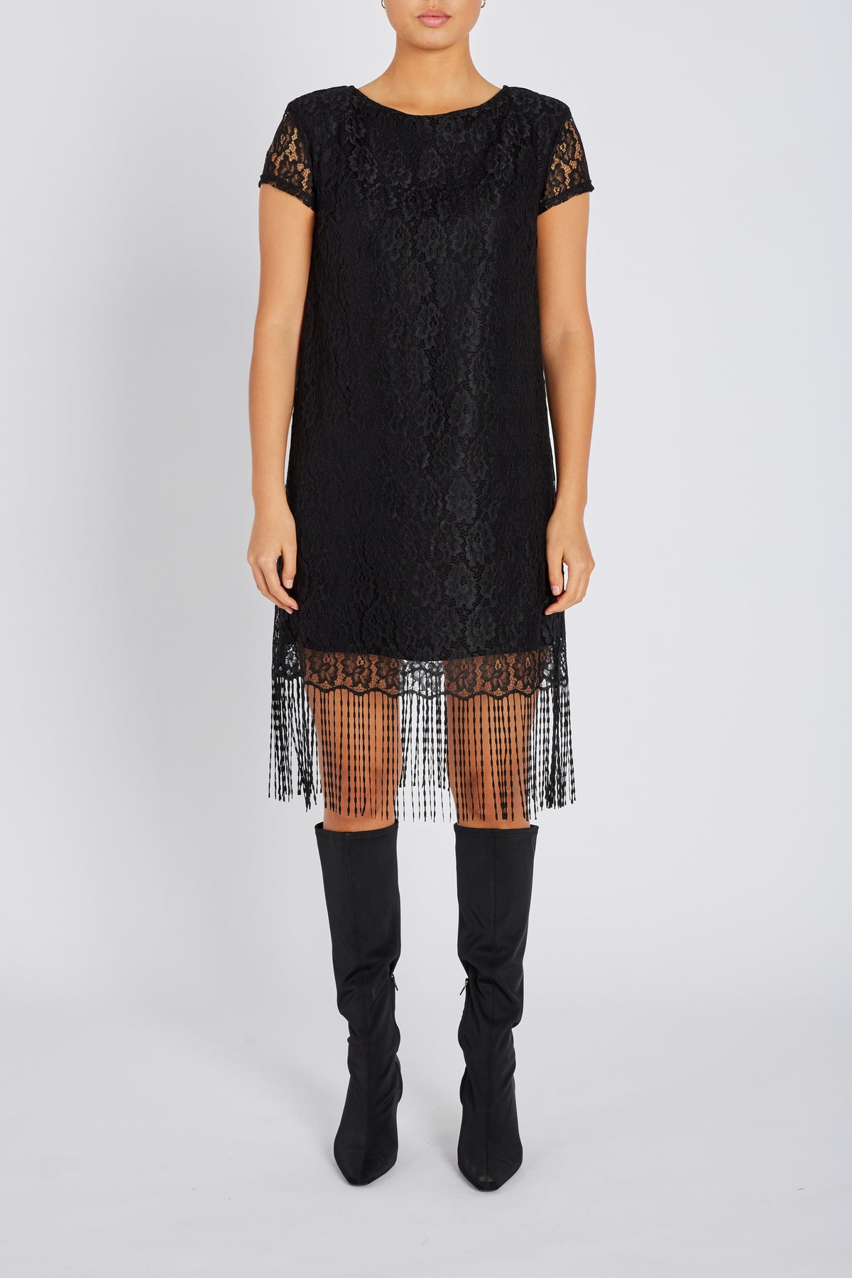 CarpusBBVianne dress is a short lace dress with fringe hem and short sleeves. The design offers a feminine silhouette with elegant details. Style it with heels and a clutch for gala or party, or wear it with boots for a modern everyday look. - Regular fit - Short lace sleeves - Fringe hem - Sheer lace pattern