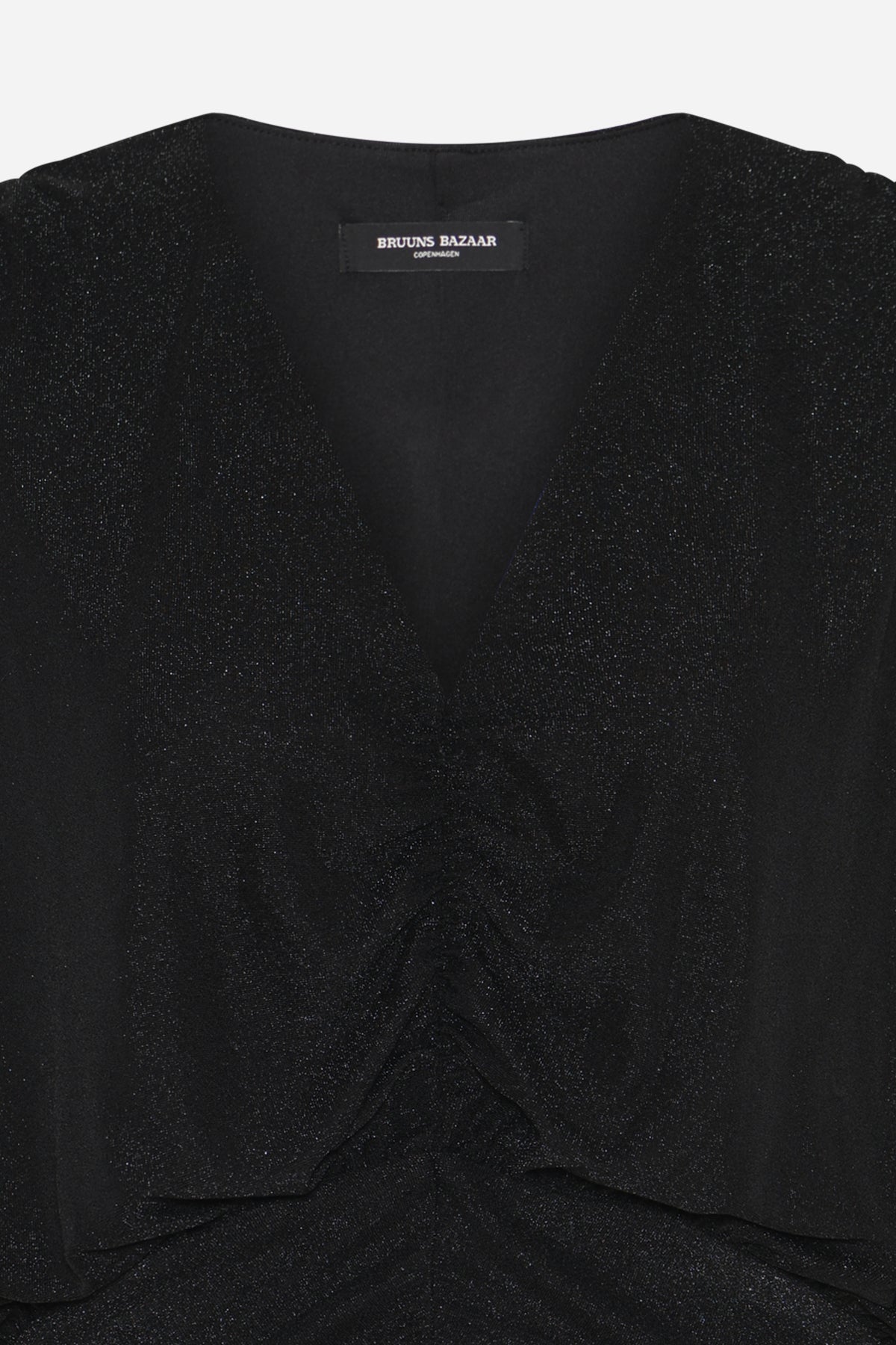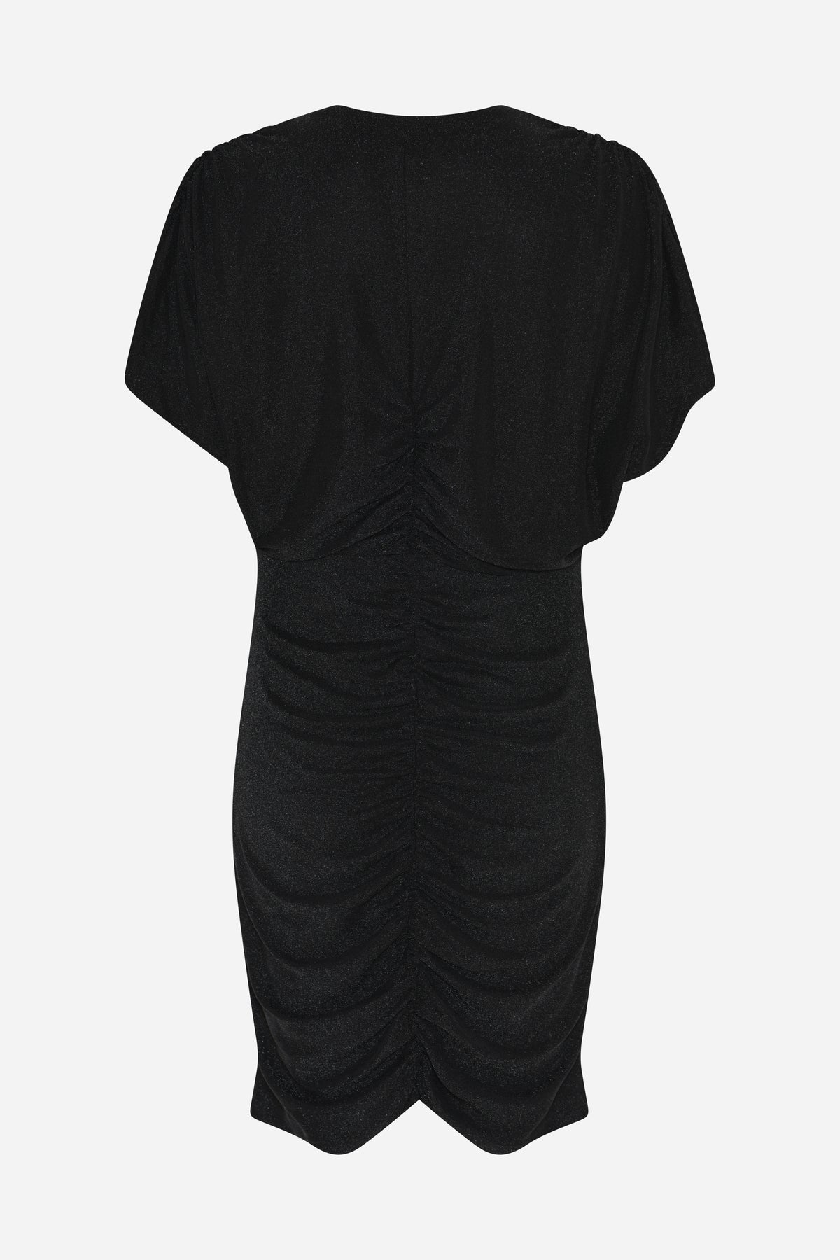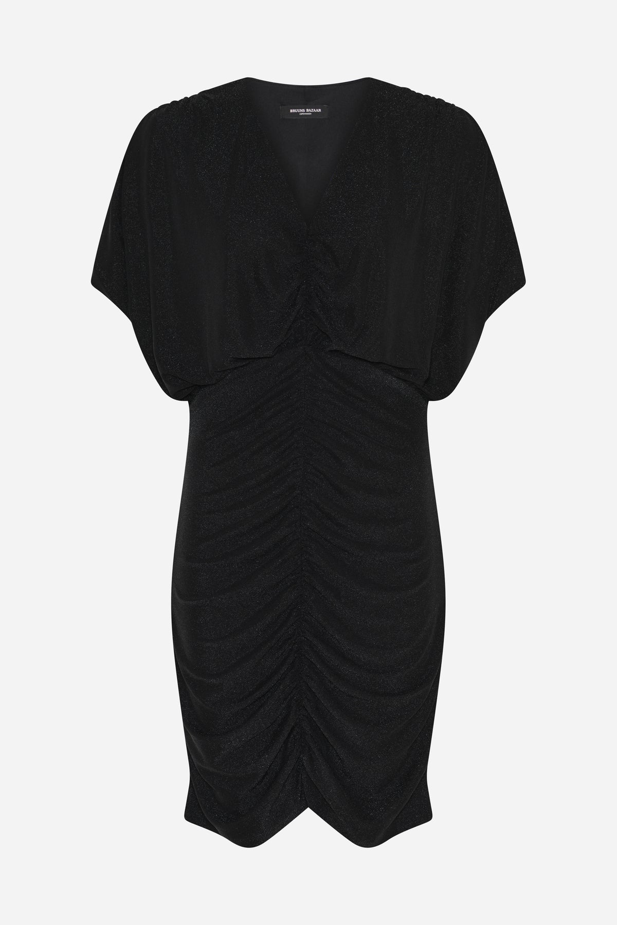 The Comfrey BBAmanda dress is an elegant short dress with draped details, V-neckline, and a light glitter finish, giving it a modern and sophisticated look.