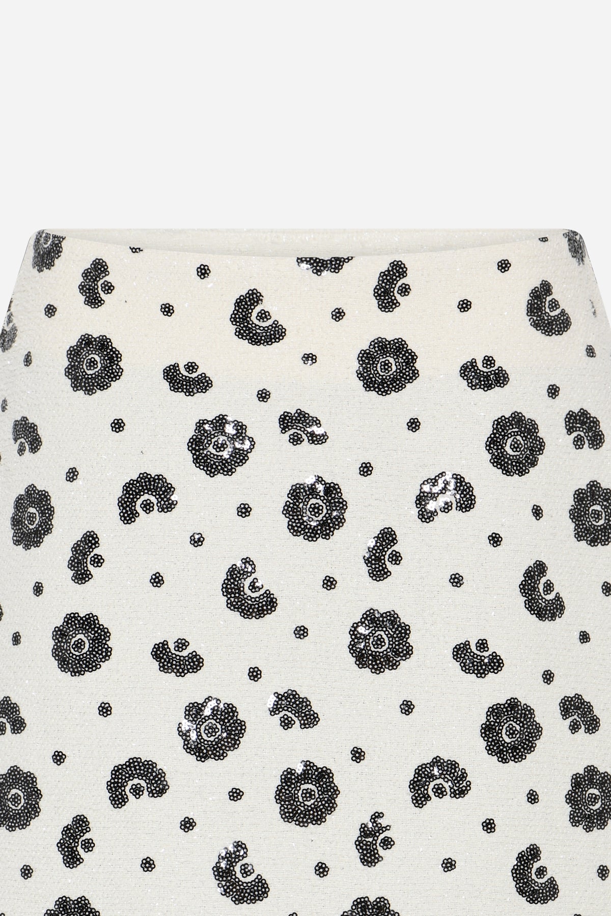 BrittleBBSiane skirt is a short skirt in cream fabric with black floral embroidery and subtle sequin shine. A festive piece with a modern edge and textured detailing.