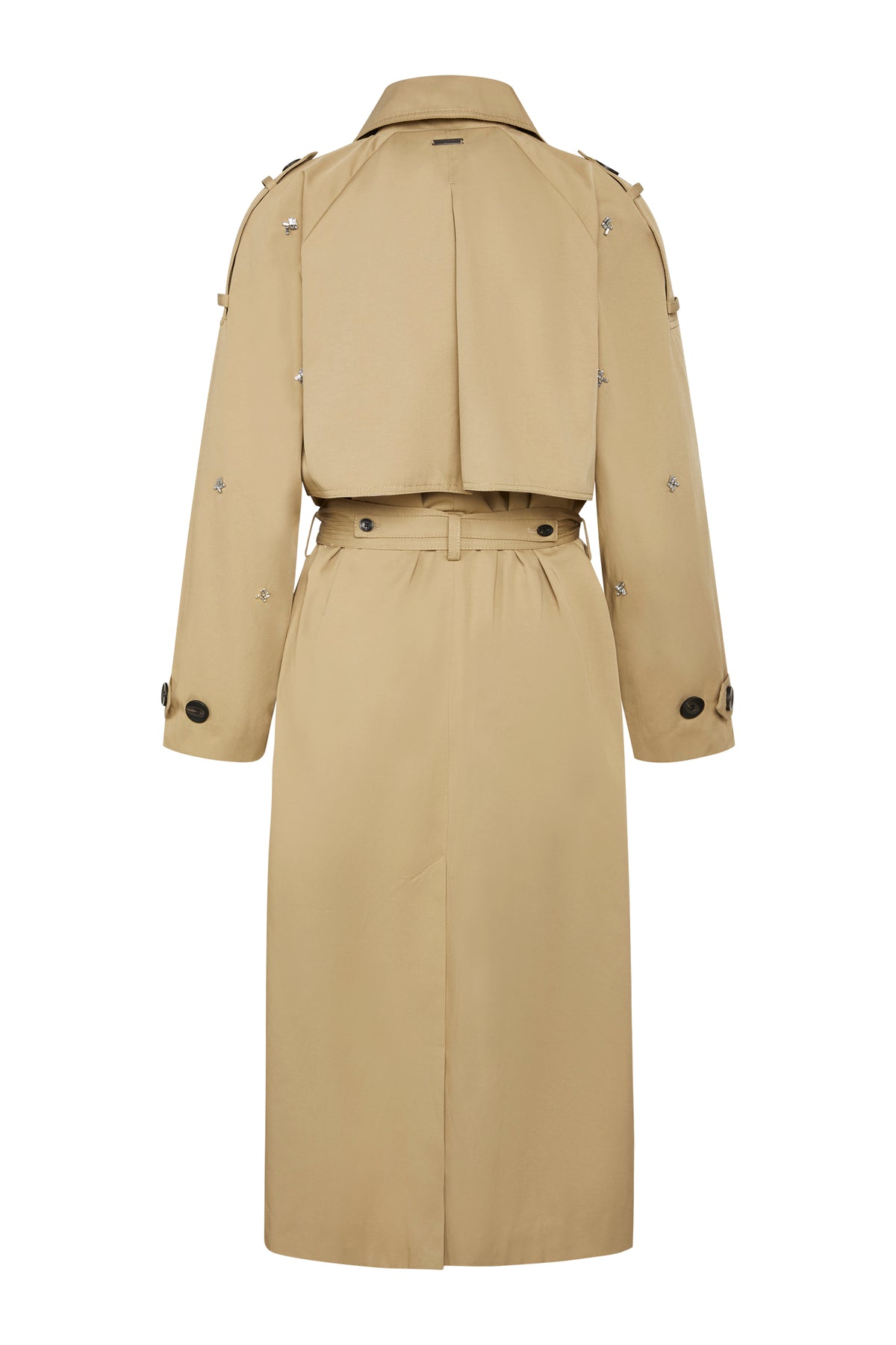A classic trench coat is a must-have in any wardrobe. This beautiful trench coat is designed with a notched lapel, epaulettes on the shoulders, long sleeves with a belted detail, side pockets, button closure, and is lightly lined.
