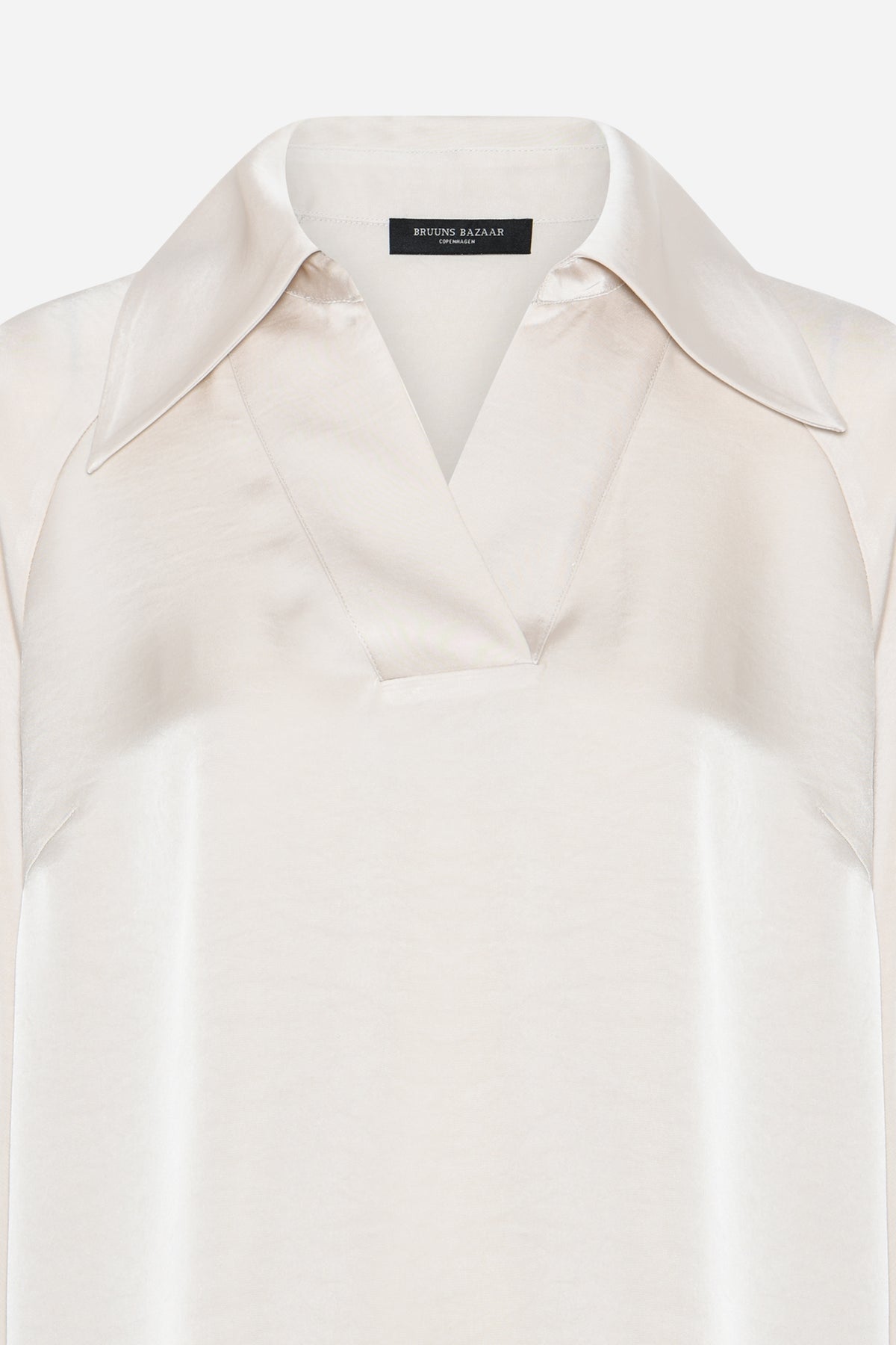 BeckiaBBKassindra blouse is an elegant satin-look blouse with a relaxed fit and a pointed collar. The shiny fabric adds a refined touch, making it ideal for both workdays and evening occasions.