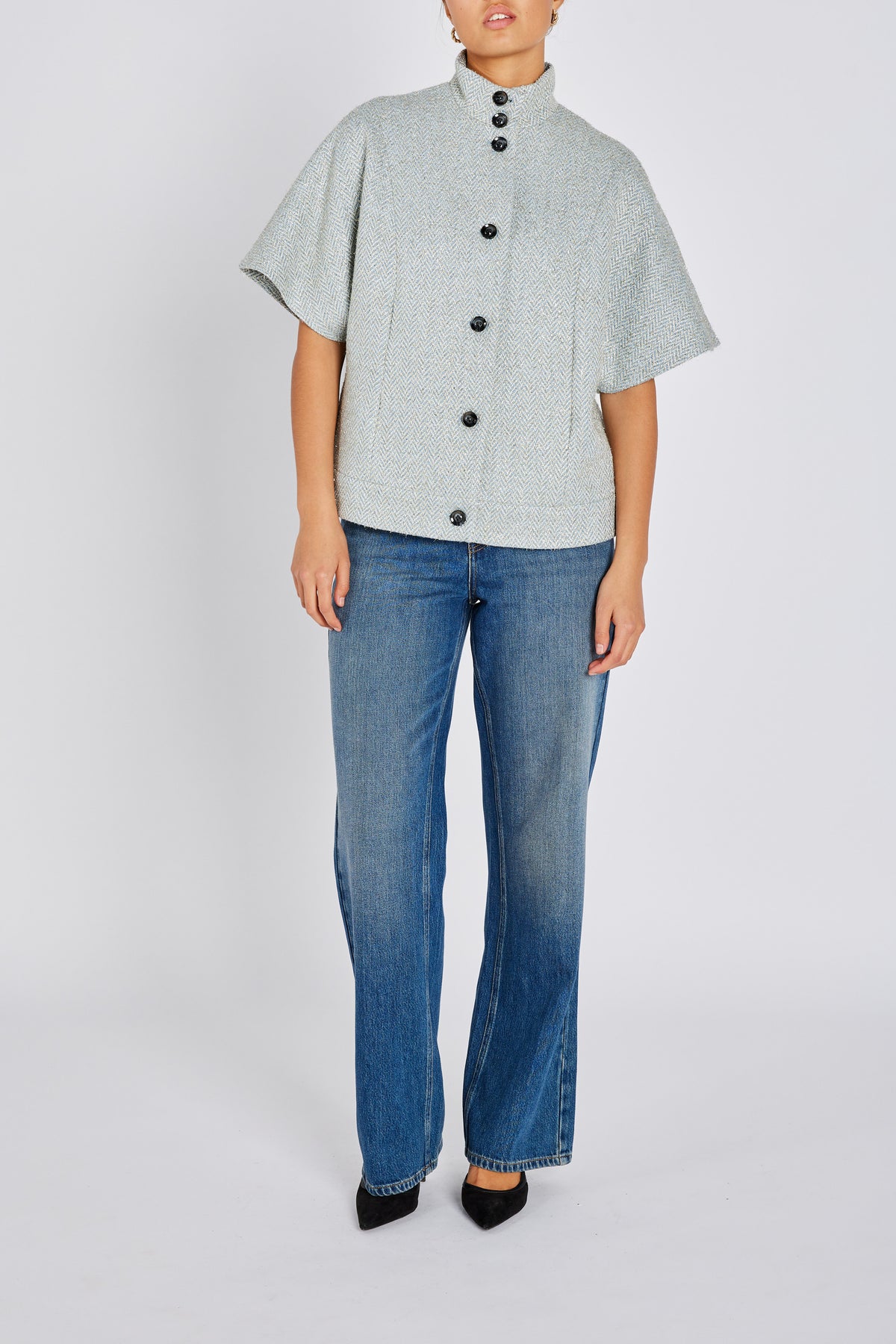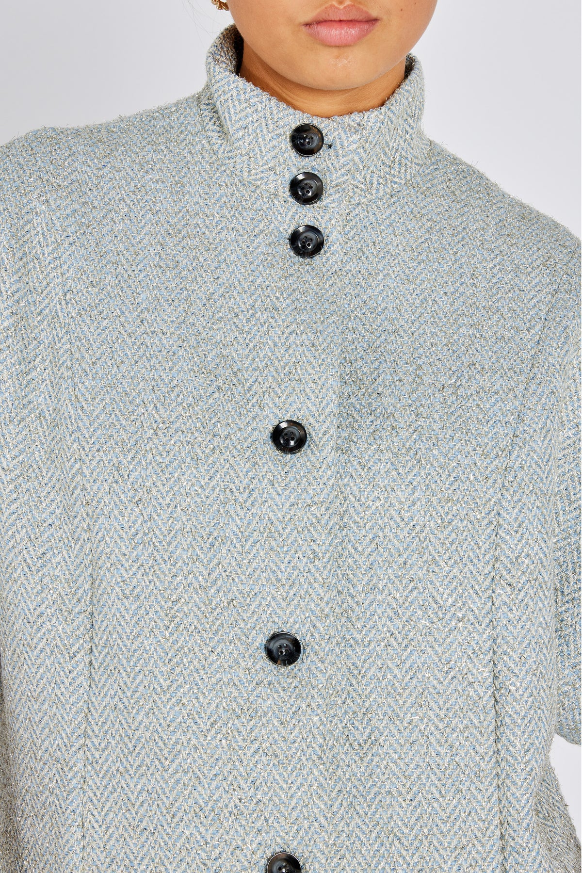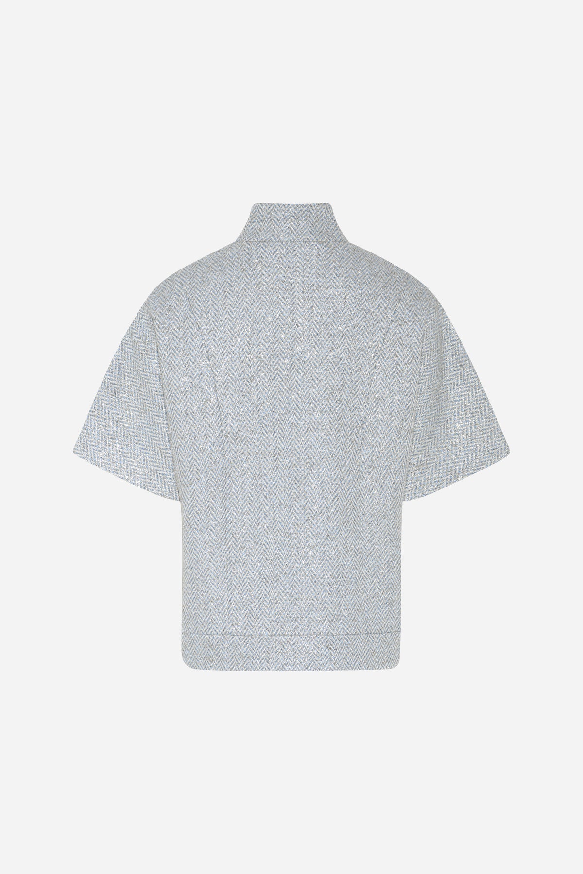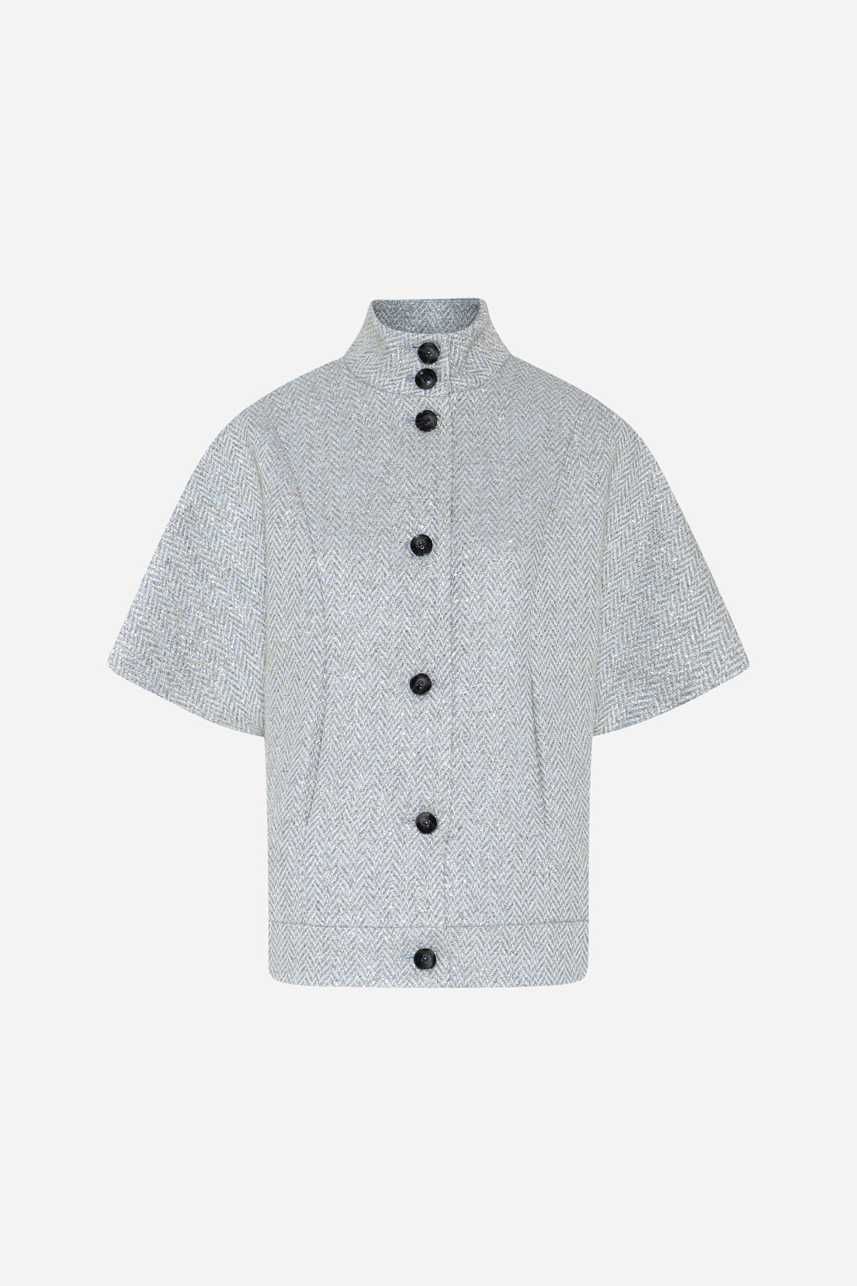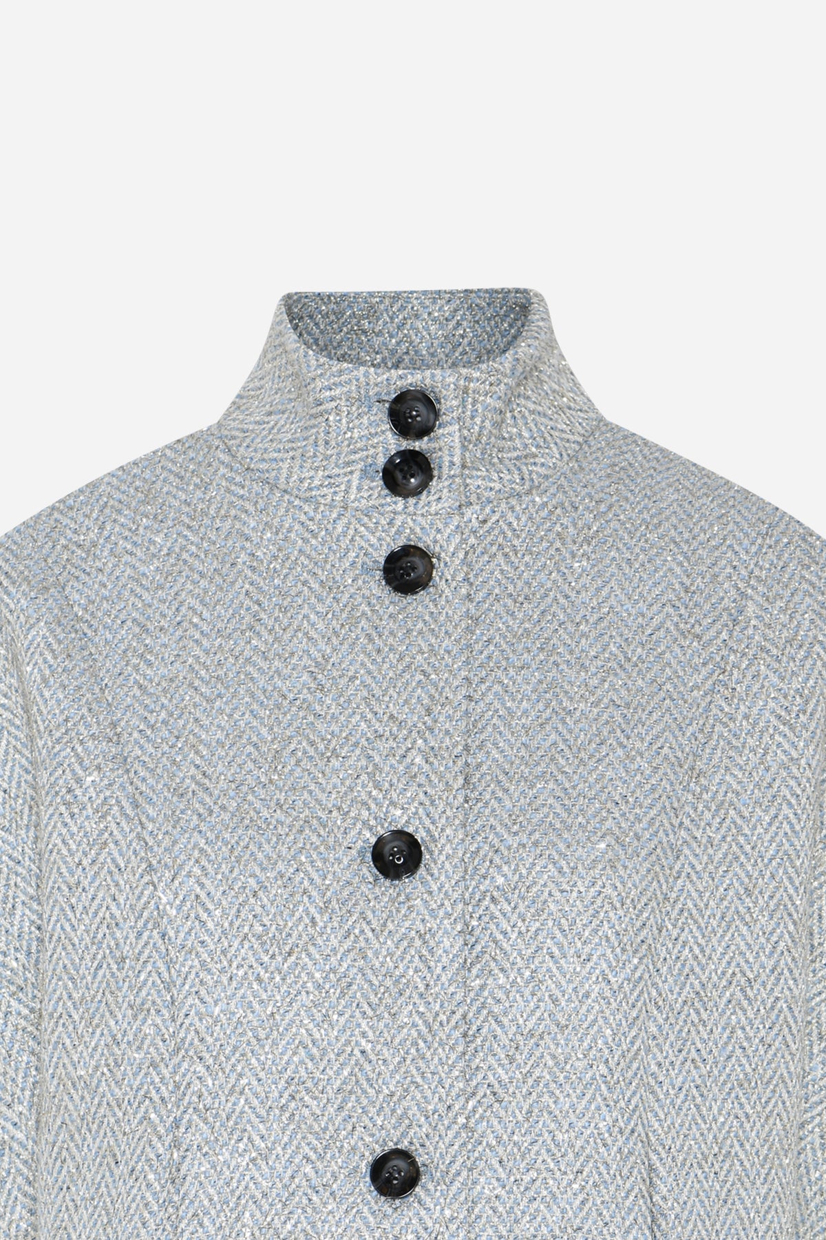 - Short length - High collar - Woven pattern - Front button closure