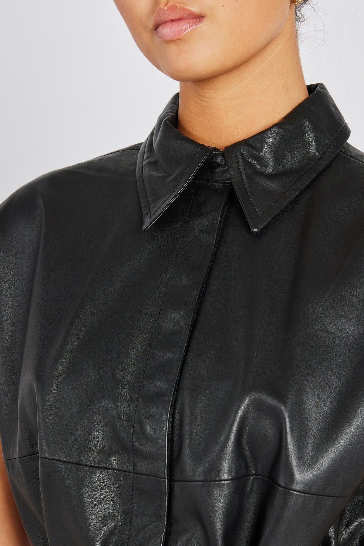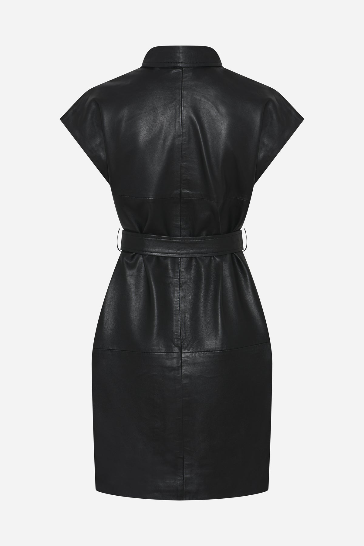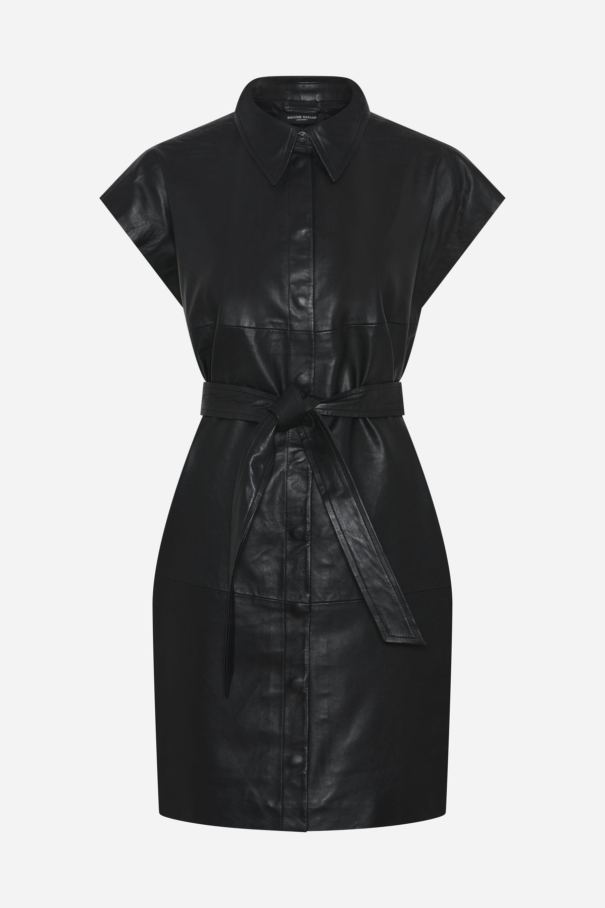 - Short leather dress with tie belt - Classic shirt collar and button closure - Regular fit - Sleeveless with defined waist