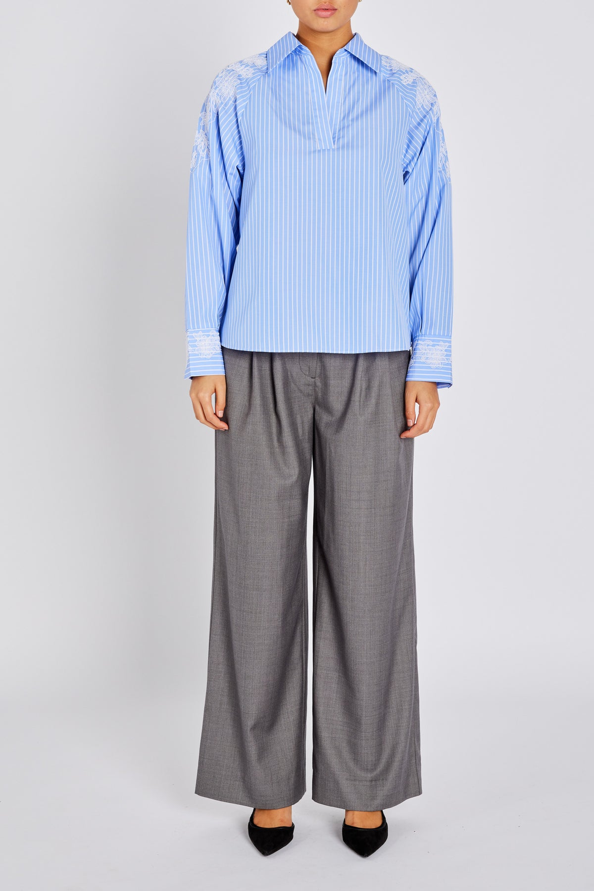 The MesquiteBBKaloe blouse is a modern and elegant piece featuring classic stripes and delicate embroidery details on the shoulders and cuffs. The open neckline with a collar adds a relaxed yet feminine touch, making it easy to dress up or down depending on the occasion. A timeless blouse that blends comfort with refined design.